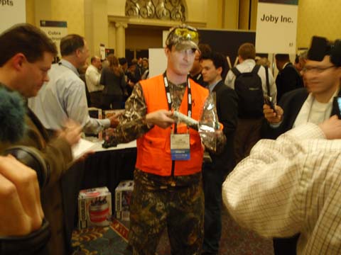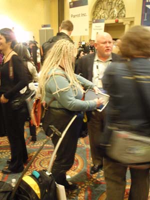 Ab 16:00 Auftakt-Veranstaltung "CES Unveiled" (enthüllt) im Venetian Ballroom. Bin schon richtig aufgeregt, wie ein altes Schlachtross, endlich wieder Messetrubel!Die Knechte machen einen Riesen-Bohei: "If you have no VIP-badge please go to the end of the line!" "Let me scan you blue card, please!"Naja, soooviel ist dann auch wieder nicht los: Halt ein großer Raum, Tische rings um die Wände an denen sich Firmenn wie Lenovo, Blaupunkt, Mitsubishi, Samsung, Logitech und so fort, mit ein bissl Zeugs aufgebaut haben. Entlang der Mittelachse Buffet-Inseln mit Sushi, Fingerfood (Sehr zu empfehlen 'Mini Chicken Wellington'), Gulasch, süße Kanapees. In den Ecken zwei improvisierte Bars (Es gibt aber keinen 'ham-spiced apple juice'. Doch dafür recht süffiges rotes Bud ( das blaue ist für weenies)) Dazwischen drängelt sich die Presseschar. Auch hier gibt's die Spezies des älteren ungarischen Korrespondenten. Bekannte hab ich noch nicht getroffen.